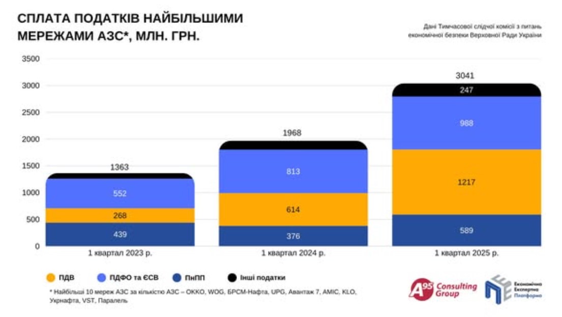 Невероятно, но факт: в I квартале 2025 года десять крупнейших автозаправочных сетей уплатили более 3 млрд грн операционных налогов (НДС, НДФЛ, ЕСВ и налог на прибыль). Это в 2,5 раза больше, чем в I кв. 2023 г., и в 1,5 раза больше — чем за аналогичный период 2024 года.