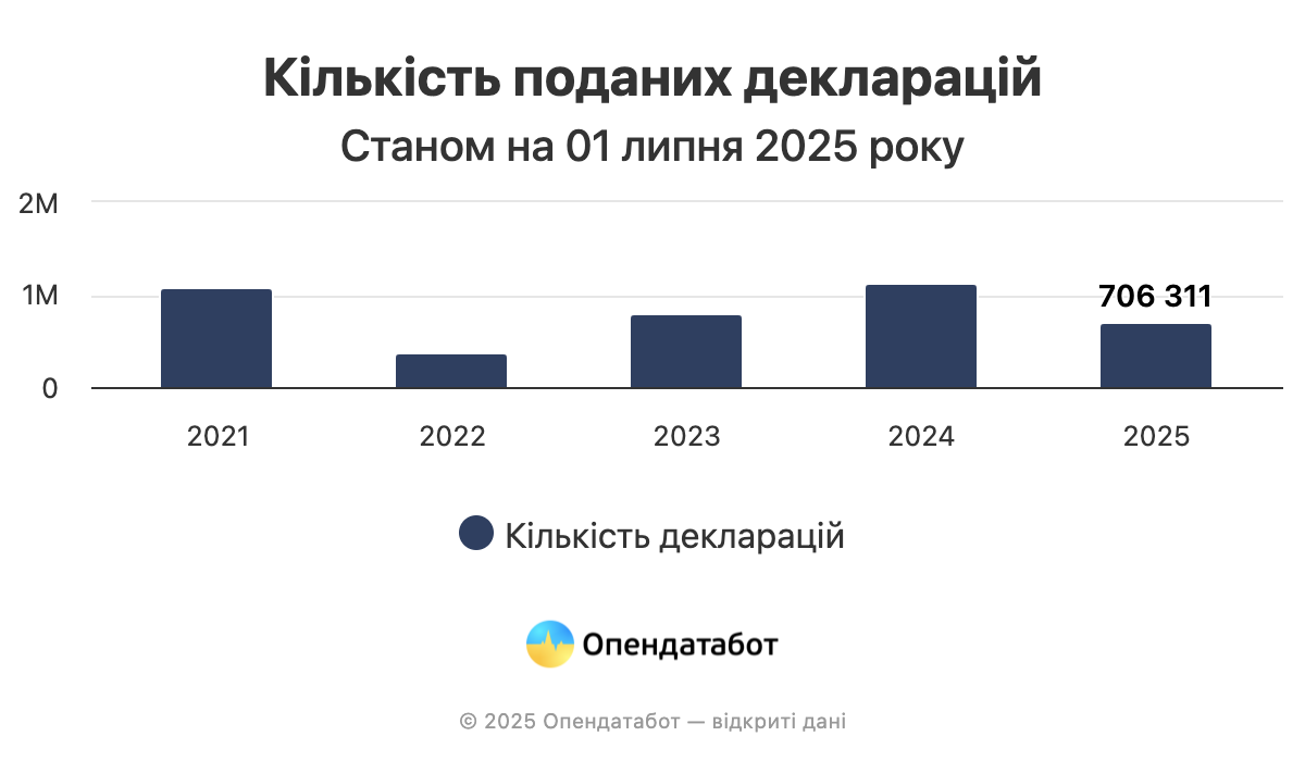 706 311 деклараций было подано с января по июнь 2025 года. Речь идет о декларациях, касающихся в прошлом году. Это на 34% меньше, чем за аналогичный период 2024 г. Об этом говорится в данных Опендатабота.