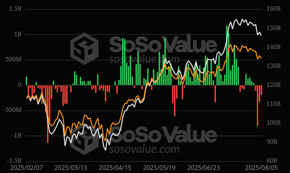Во вторник, 5 августа, 11 американских биткоин-ETF зафиксировали совокупный чистый отток в размере $196 миллионов. Наибольшая доля пришлась на фонды от Fidelity (FBTC) и BlackRock (IBIT). Эта серия оттоков является самой длинной с апреля и включает потерю $114,83 млн в четверг, $812,25 млн в пятницу и $333,19 млн в понедельник.