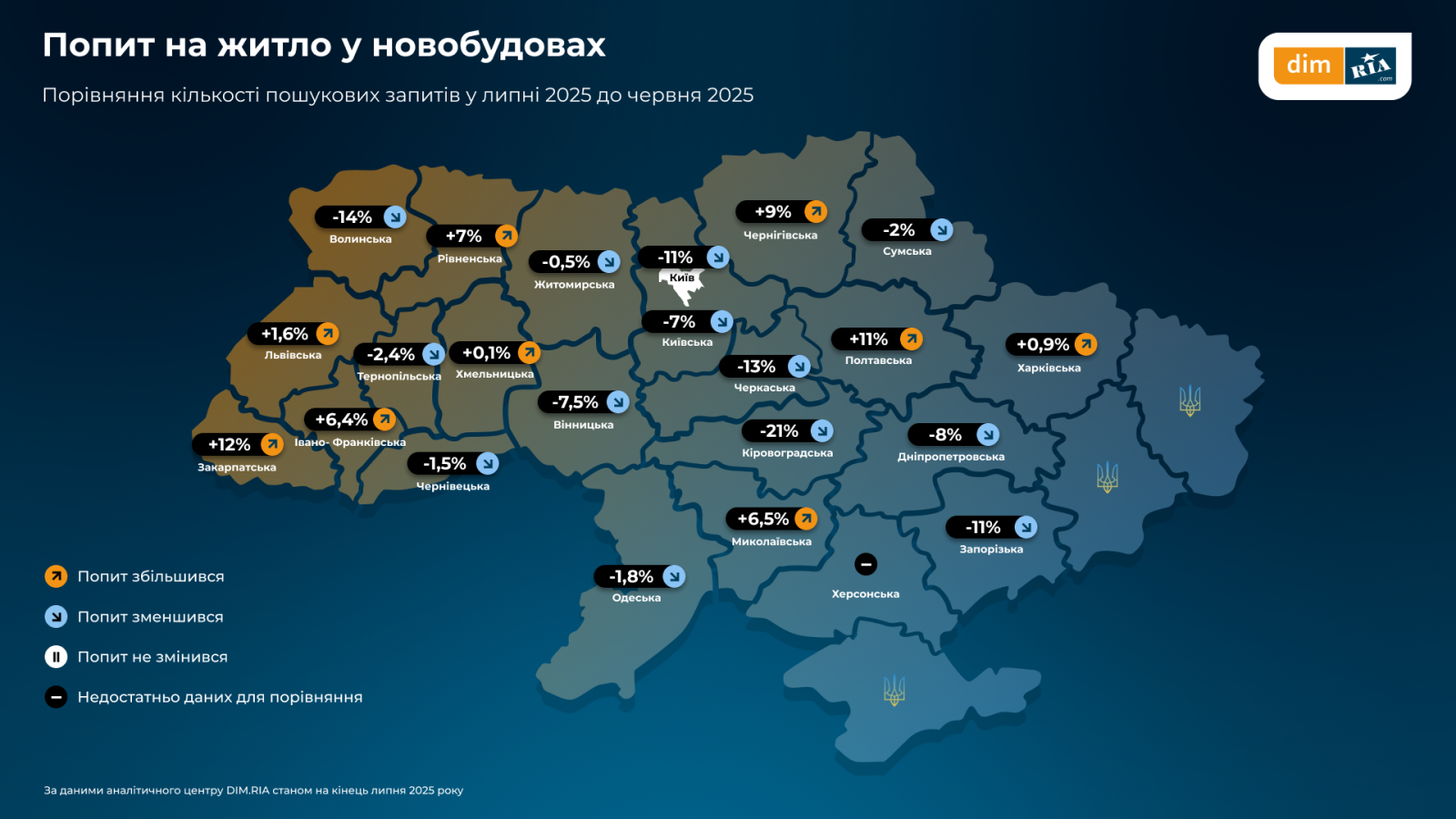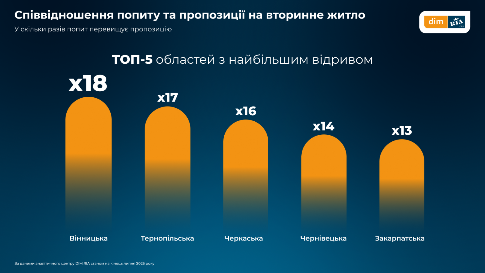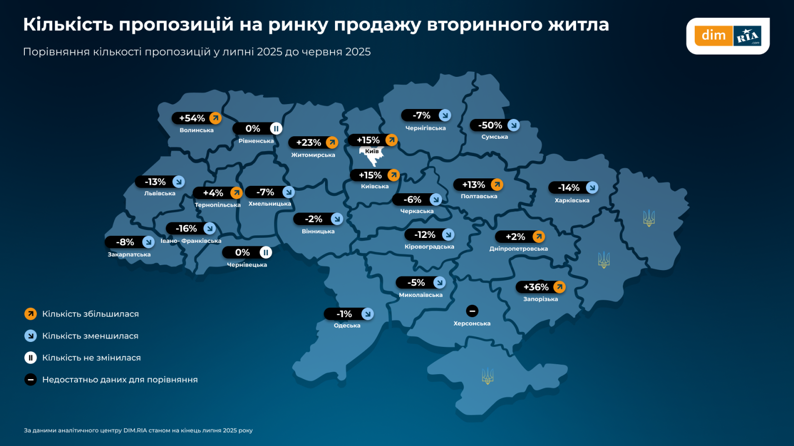 Значительный рост интереса к вторичному жилью зафиксирован в Хмельницкой, Херсонской и Ивано-Франковской областях. В Тернопольской области наблюдается заметное снижение спроса — падение на 25% по сравнению с июнем.
