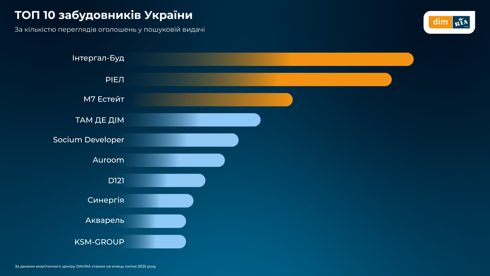 Интерес к новостройкам среди пользователей в июле отличался в регионах. В некоторых областях наблюдается значительный рост спроса — Закарпатская (+12%), Полтавская (+11%), Черниговская (+9%). В значительной части регионов интерес продолжает падать — Кировоградская (-21%), Волынская (-14%). Среди застройщиков наибольший интерес пользователи Dim.ria проявляют к проектам компаний «Интергал-Буд» и «Риэл».
