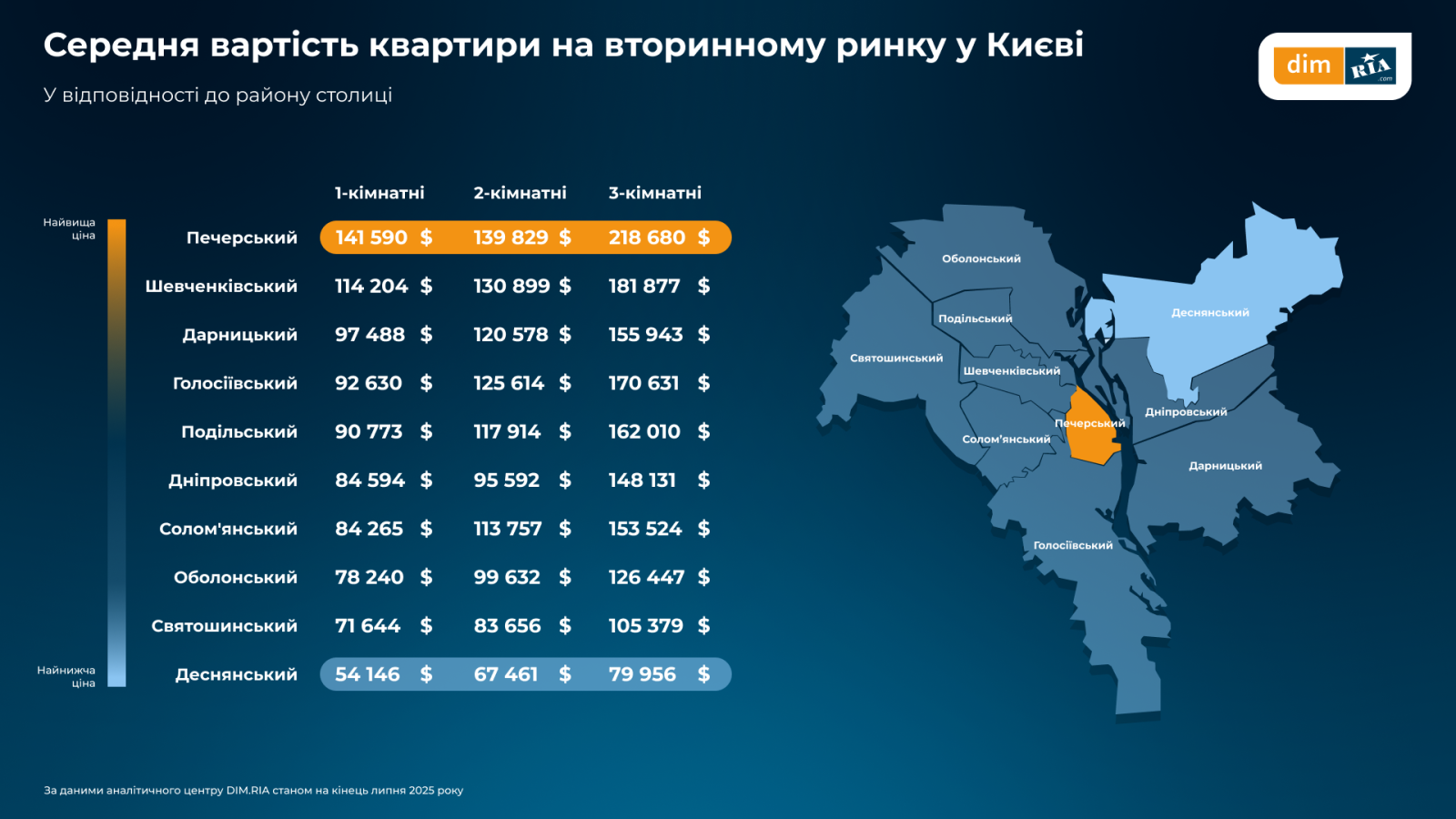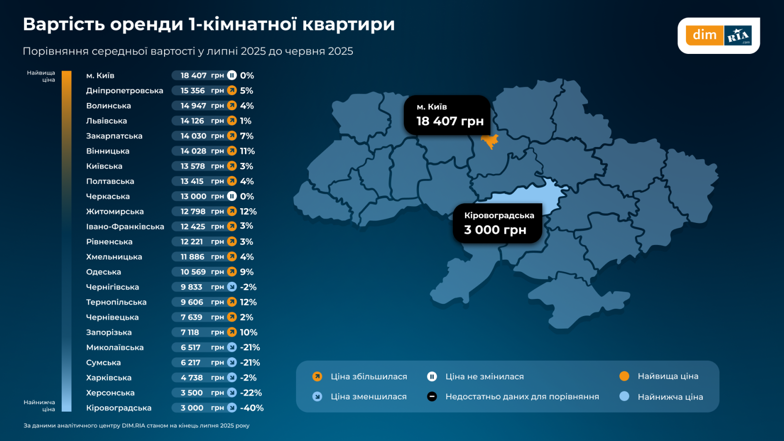 Киев продолжает лидировать по цене аренды жилья: средняя стоимость в июле осталась на уровне 18,4 тыс. грн в месяц. В разрезе 1-комнатных квартир Печерский район самый дорогой — 25,2 тыс. грн, самым дешевым остается Деснянский — 10,3 тыс. грн.
