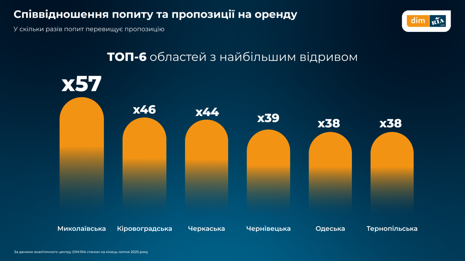 Соотношение количества объявлений об аренде и количества отзывов на них в июле в Киеве составляет 1:9, а вот в большинстве областей эти показатели отличаются в разы: самый высокий дисбаланс в Николаевской — 1:57.