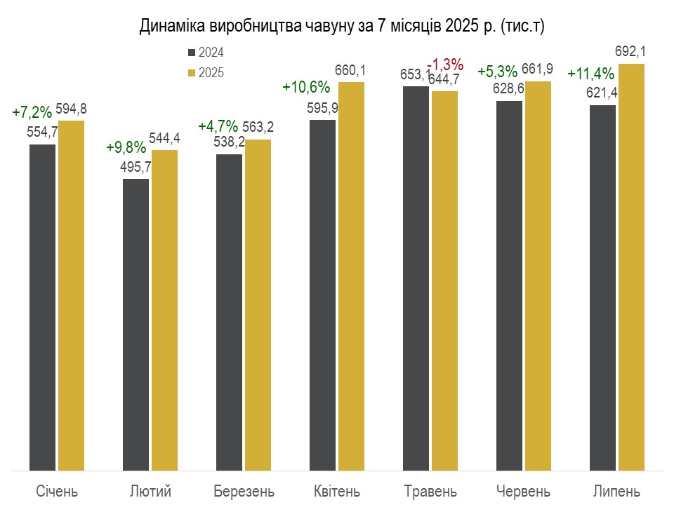 В то же время, производство чугуна демонстрирует противоположную динамику. За январь-июль 2025 года его объемы выросли на 6,7% по сравнению с аналогичным периодом прошлого года, достигнув 4,36 млн. тонн. В июле показатели производства чугуна были лучшими с начала года — 692,1 тыс. тонн, что на 4,5% больше, чем в июне.