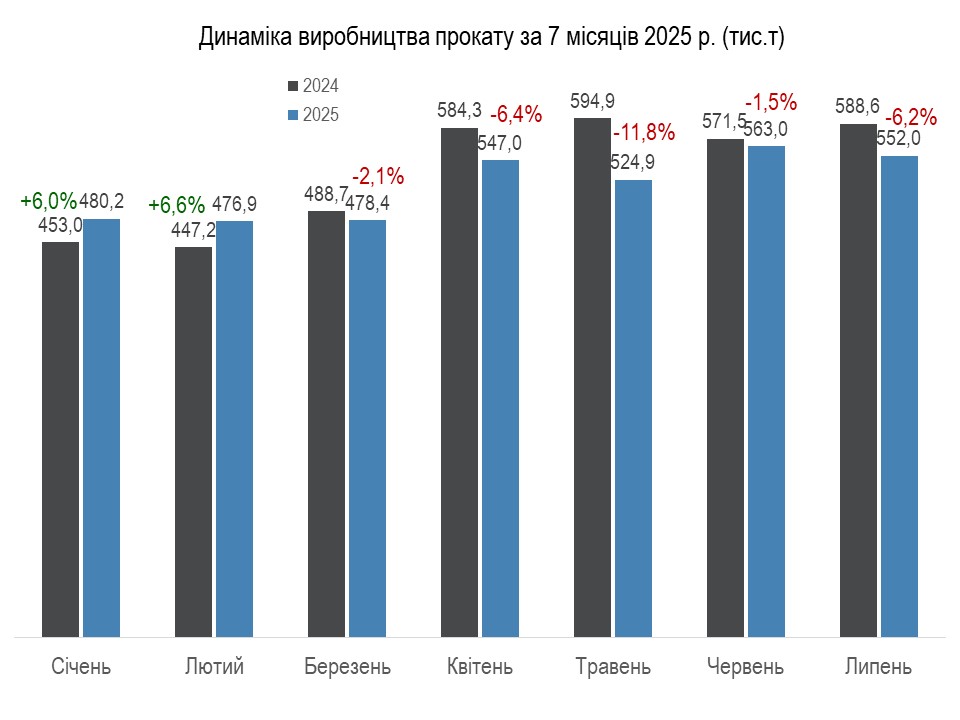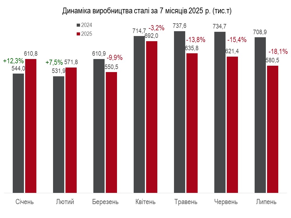 Согласно отчету только в июле было выплавлено 580,5 тыс. тонн стали, что на 18% меньше по сравнению с июлем прошлого года и на 6% меньше, чем в июне 2025 года.