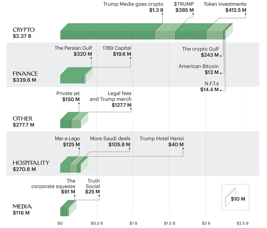 Хотя точная стоимость активов президента неизвестна, поскольку он отказался от добровольной подачи налоговых деклараций, СМИ приводят разные цифры. К примеру, The New York Times в мае 2025 года писала, что за месяц семья Трампа заработала до $2 млрд на разных проектах, включая не только криптоактивы, но и недвижимость, подарки и роялти.