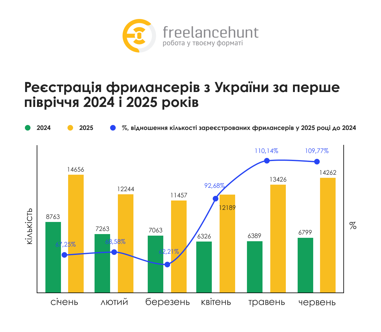 Рынок фриланса в Украине показывает беспрецедентный рост. В первом полугодии 2025 года количество украинцев, избравших фриланс-формат, выросло на 83,6% против аналогичного периода 2024 года. Основные драйверы изменений — последствия войны, трансформация рынка труда и развитие цифровых технологий. Об этом свидетельствуют данные платформы Freelancehunt.
