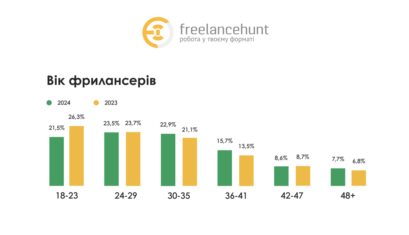 По данным исследования «Портрет фрилансера 2024» от компании Freelancehunt, около 45% украинских фрилансеров составляет молодежь в возрасте 18−29 лет. Это поколение активно осваивает цифровые инструменты и интегрирует их в рабочие процессы.