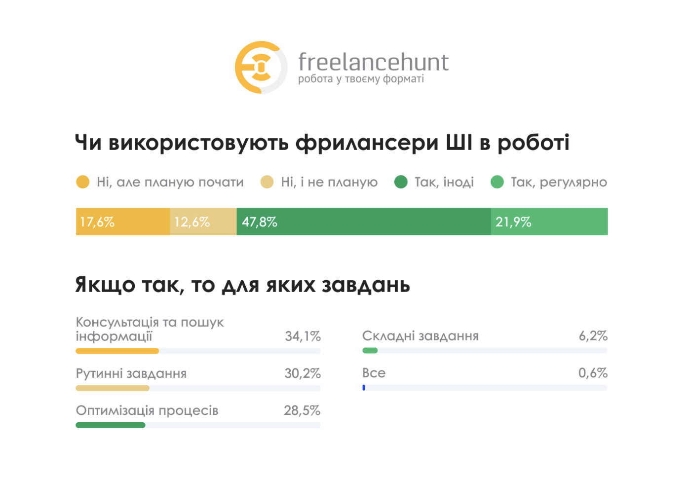 В частности, 69% украинских фрилансеров уже используют инструменты на основе искусственного интеллекта (AI): 21,9% регулярно, 47,8% периодически. Только 12,6% пока не планируют применять AI в своей работе.