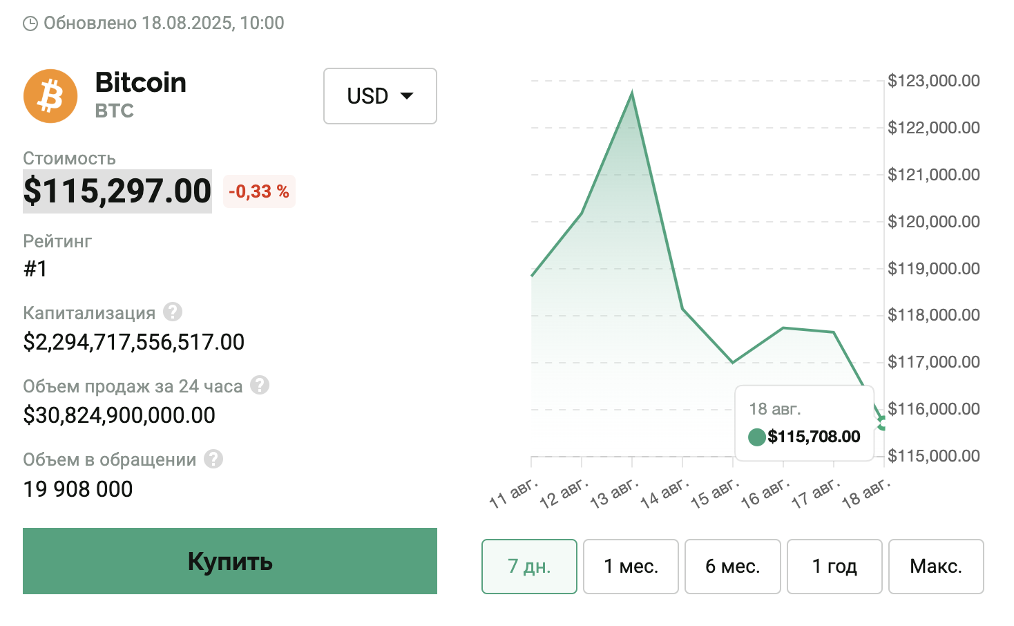 Согласно интерактивной таблице «Минфина», стоимость первой криптовалюты по состоянию на 10:00 составляет $115,297.00 за монету.