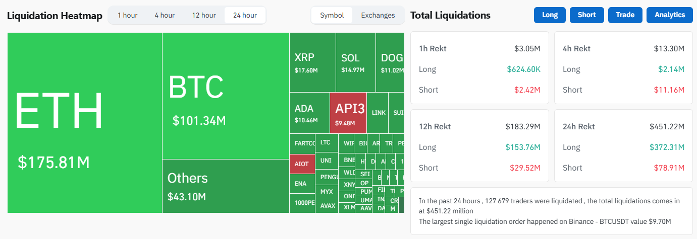 За последние сутки на рынке криптовалют произошли значительные ликвидации, совокупный объем которых превысил $451 миллион. Об этом свидетельствуют данные аналитической платформы Coinglass.