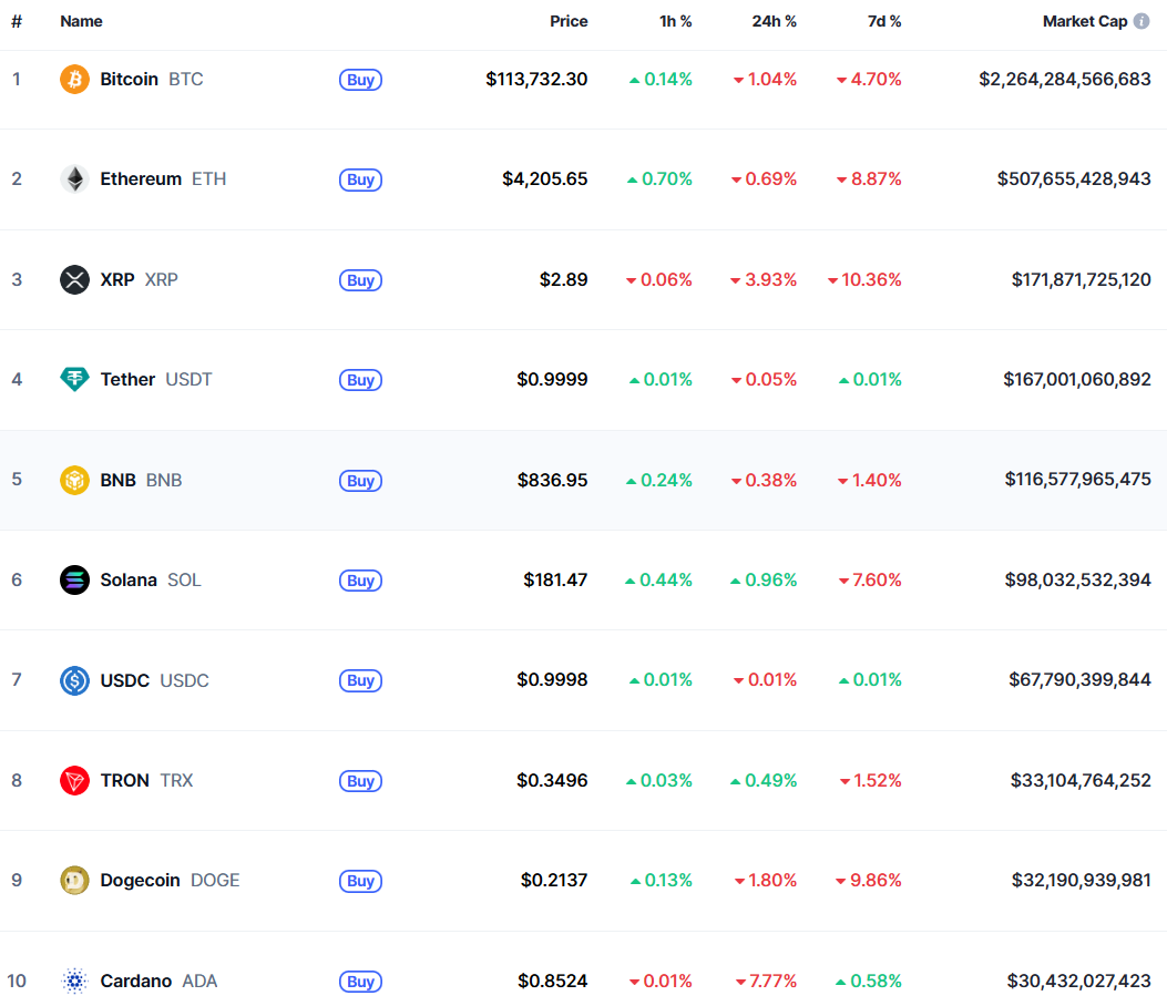 В среду, 20 августа, на крипторынке продолжилась коррекция. Курс первой криптовалюты в данный момент снизился до $112 600, Ethereum — $4 070. Об этом свидетельствуют данные CoinMarketCap.
