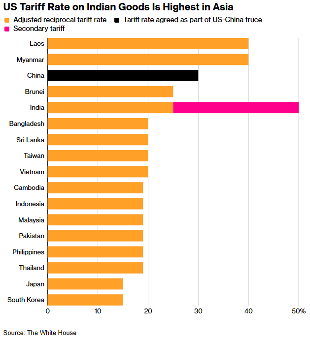Несмотря на это, экономическое влияние на Индию может быть ограничено, поскольку ее экономика в значительной степени зависит от внутреннего спроса, а не от экспорта. Экспорт в США составляет всего около 2% ВВП Индии. Однако реакция рынков оказалась отрицательной: рупия стала самой слабой валютой в Азии, а с июля индийские фондовые биржи уже потеряли около $5 млрд. иностранных инвестиций.
