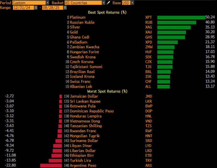 По итогам первых семи месяцев 2025 года платина, российский рубль и серебро продемонстрировали наибольший рост по отношению к доллару США. В то же время в лидерах падения оказались валюты Аргентины, Турции и Эфиопии. Украинская гривна за этот период осталась практически стабильной. Об этом пишет в Facebook финансовый аналитик Андрей Шевчишин.