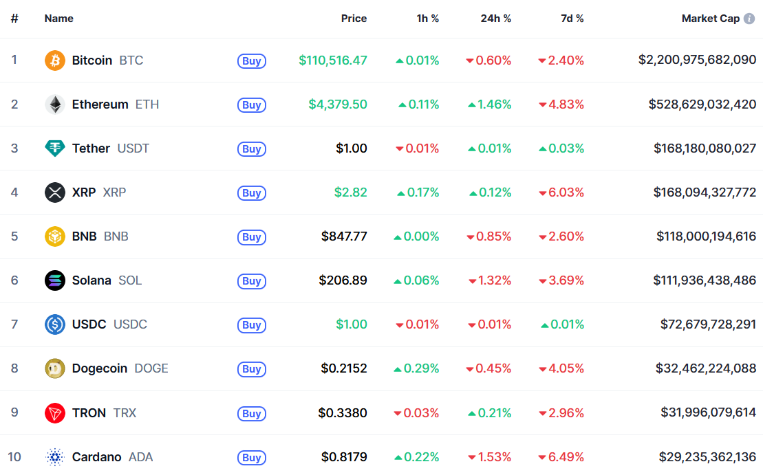На момент написания новости биткоин торгуется на уровне $110 516. За последние сутки его стоимость снизилась на 0,6%, а за неделю — на 2,4%.