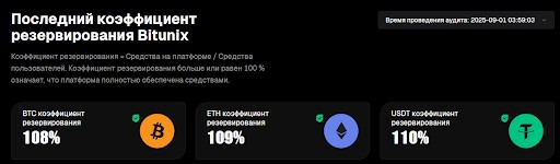 Последние данные Доказательства Резервов подтверждают, что активы пользователей полностью обеспечены, а коэффициенты резервирования для основных криптовалют выше 100%. На практике это означает, что Bitunix хранит больше средств, чем пользователи на платформе, что обеспечивает дополнительную защиту.