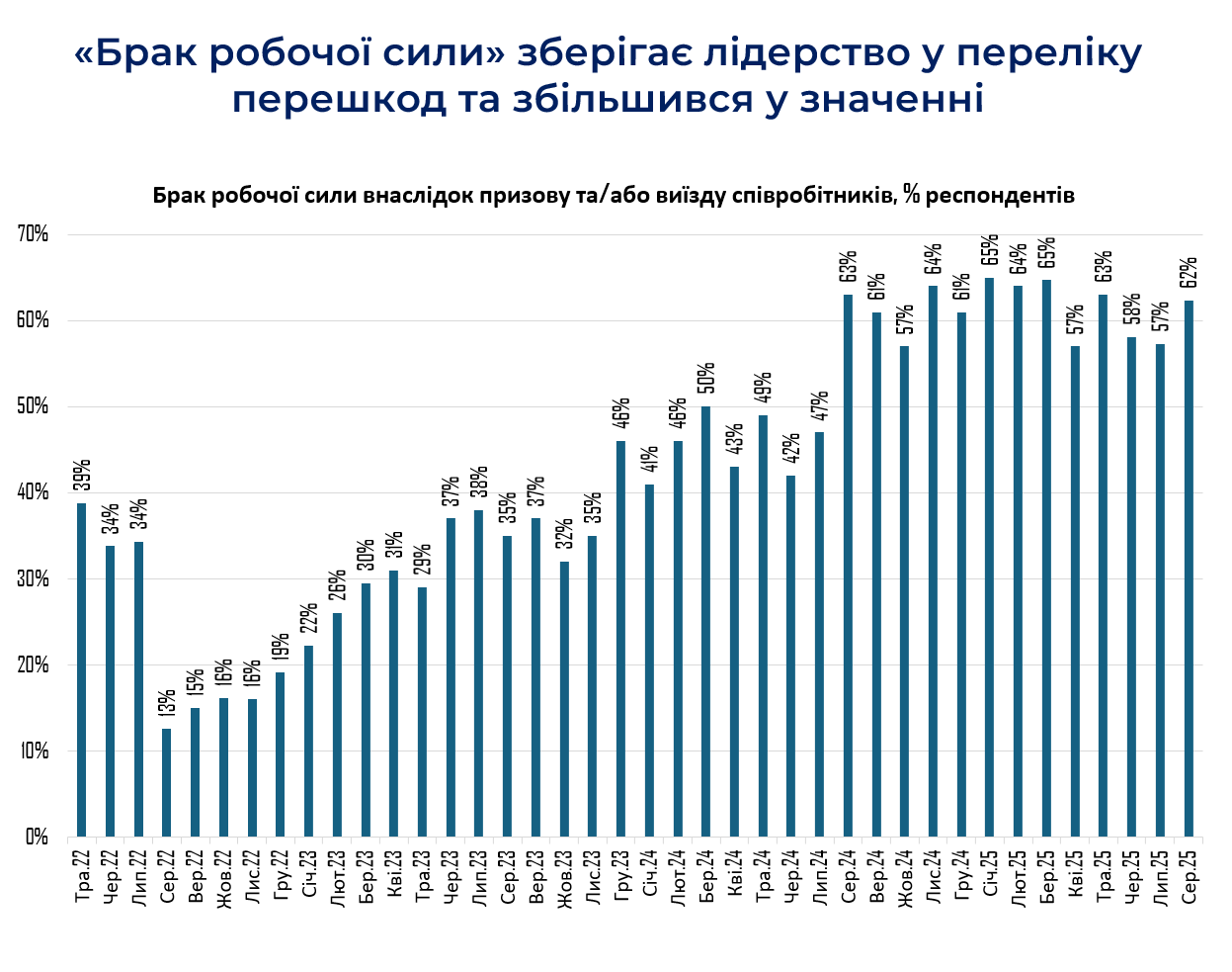 С существенным отрывом на первом месте среди основных препятствий для ведения бизнеса в военное время в августе закрепился «нехватка рабочей силы в результате призыва и/или выезда сотрудников».