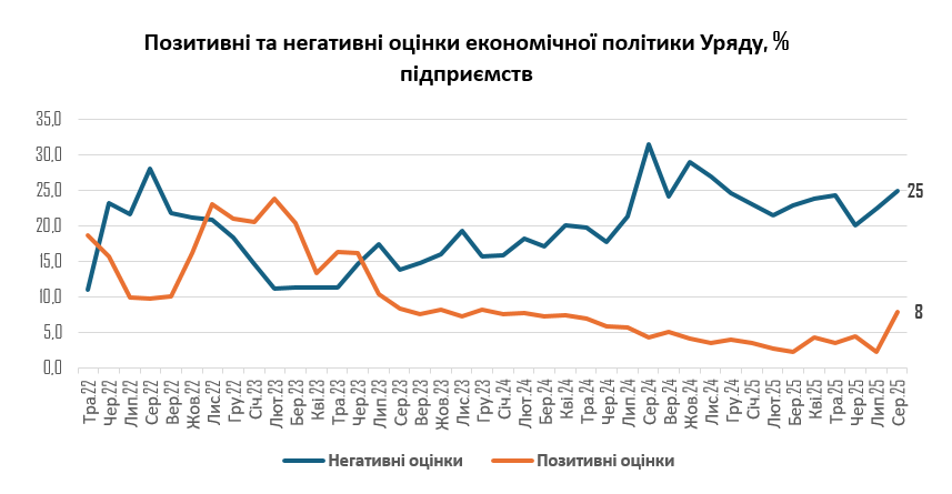 «Событие „завершения войны“ занимает первое место во всех наших полугодовых замерах. Это ключевой фактор, который, по мнению опрошенных, влияет на условия ведения бизнеса. Сейчас таких 89%. На втором месте — снижение налогов (37,6%), что почти на 10 в.п. меньше, чем в январе», — отметила исполнительная директор Института Оксана Кузякив.