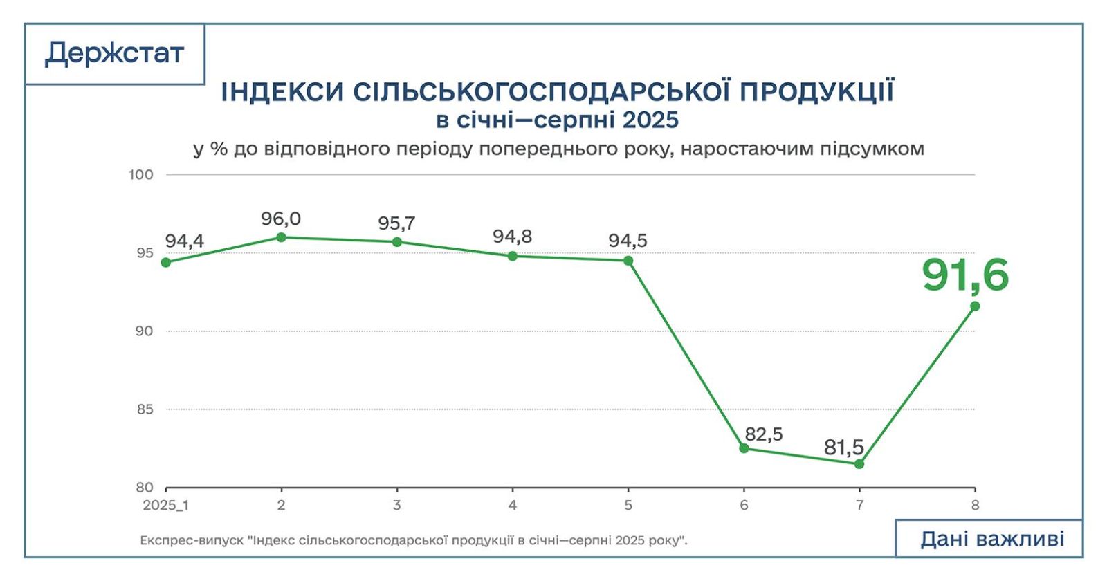 Общий спад: Индекс сельскохозяйственной продукции составил 91,6% прошлогоднего уровня.