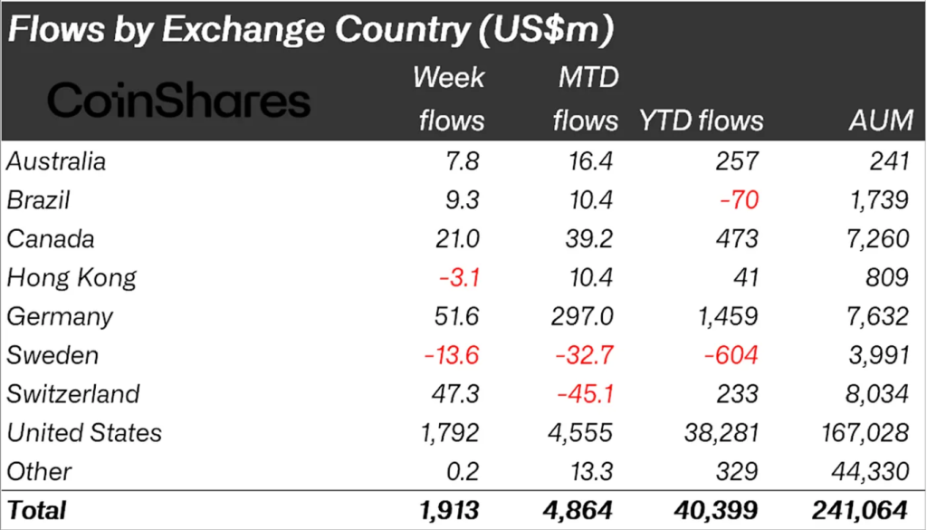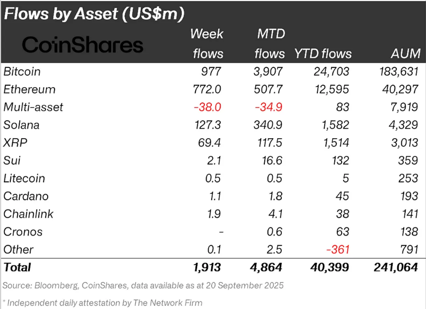 По данным отчета CoinShares, с 12 по 20 сентября криптофонды привлекли $1,9 млрд инвестиций, а общий объем активов под их управлением (AUM) достиг $40,4 млрд, обновив годовой максимум. Это свидетельствует о возобновлении интереса инвесторов к цифровым активам.