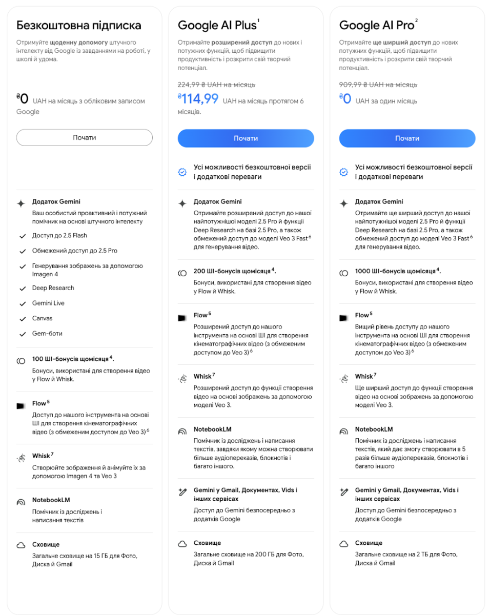 Пакет подписки на Google AI Plus доступен в Украине уже сегодня, 24 сентября, за 224,99 грн в месяц. Для новых пользователей действует скидка 50% на первые шесть месяцев — 114,99 грн. в месяц.