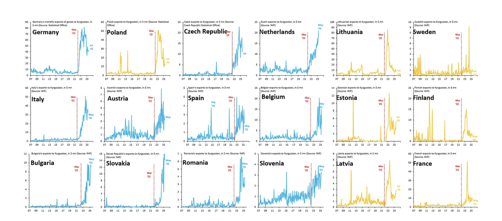 Панель диаграмм выше — это то, что я называю «Стеной позора» ЕС. Каждая диаграмма показывает ежемесячный экспорт в миллионах долларов в Кыргызстан, самый странный из всех перевалочных центров, поскольку он так удален. Действительно, если посмотреть, например, на немецкий экспорт в Кыргызстан, он мало пересекается с показывающими киргизские данные по импорту из Германии. Это потому, что Кыргызстан — это просто слово, которое пишут в экспортной накладной. Большинство этих товаров направляются непосредственно в Россию.