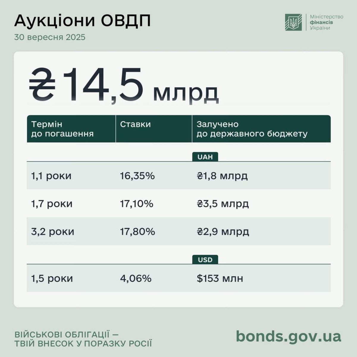 Министерство финансов 30 сентября 2025 года на аукционе по размещению облигаций внутреннего государственного займа (ОВГЗ) привлекло в государственный бюджет 14,5 миллиарда гривен в эквиваленте. Об этом сообщает пресс-служба Минфина.
