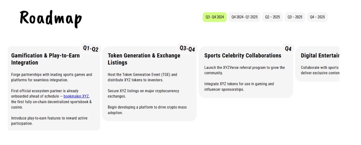 Дорожная карта включает в себя функции «играй, чтобы заработать», которые вознаграждают участие, интеграцию со спортивными ставками через bookmaker.XYZ, а также дополнительные партнерства с инфлюенсерами и игровыми проектами.