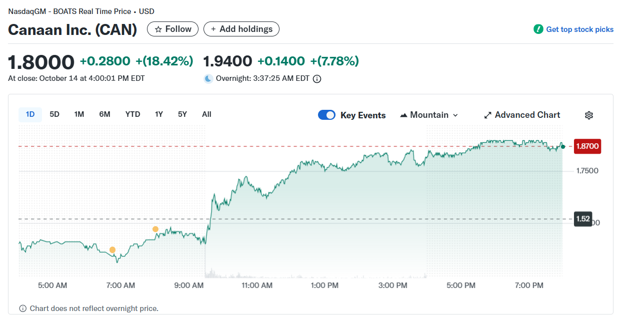 Инвесторы положительно отреагировали на эту новость: на закрытии торгов 13 октября акции Canaan выросли до $1,52, показав суточный рост на 40,09%. При этом ценные бумаги компании продолжили рост и к моменту закрытия торгов 14 октября уже составляли $1,80.