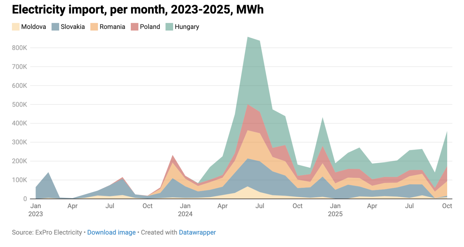 В целом импорт электроэнергии в октябре вырос по всем направлениям. По сравнению с октябрем 2024 года импорт электроэнергии в Украину вырос вдвое.