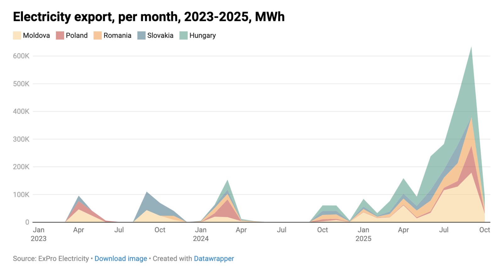 В то же время экспорт электроэнергии в октябре 2025 года упал на 85% из-за усиления обстрелов энергетической инфраструктуры. Всего за месяц было экспортировано 90,8 тыс. МВт-ч электроэнергии в страны ЕС и Молдовы.