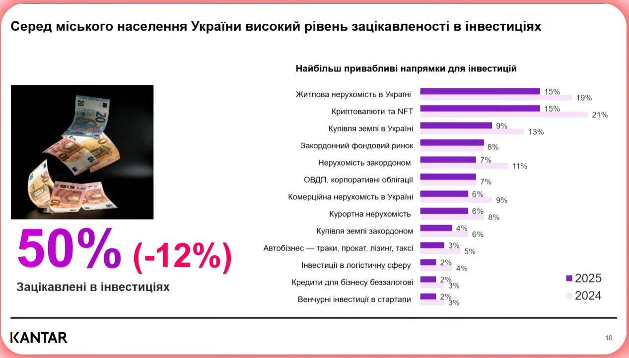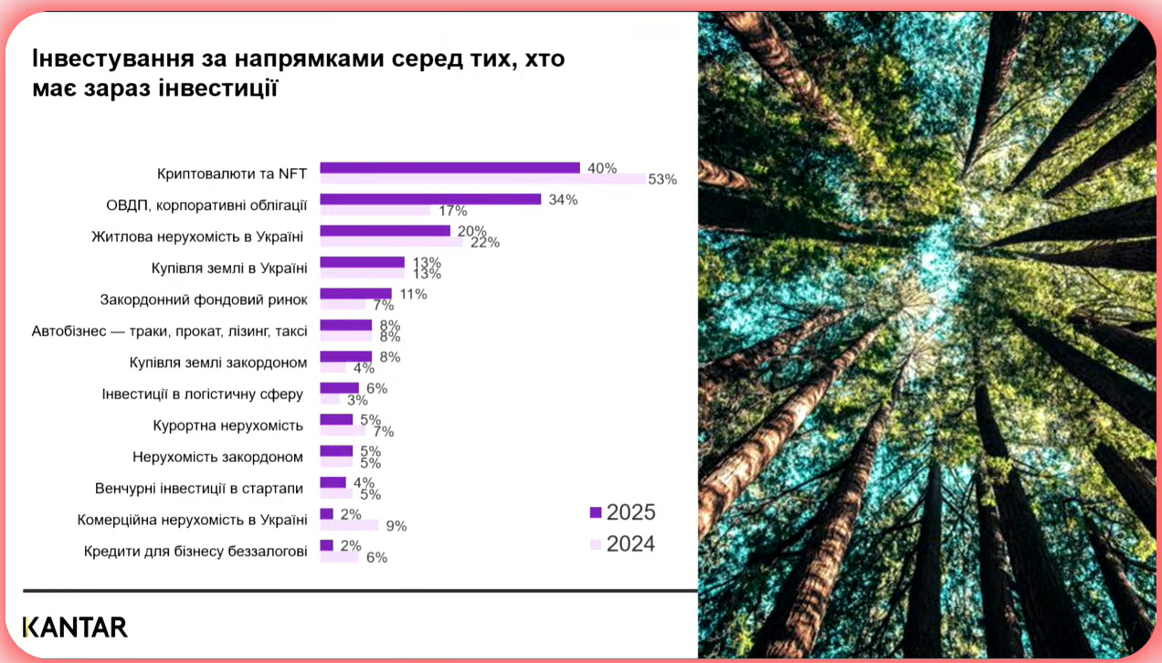 Данные Kantar Ukraine по инвестированию по направлениям среди тех, кто уже имеет инвестиции, демонстрируют заметное падение доверия к криптовалюте и рост интереса к традиционным и государственным инструментам в 2025 году.
