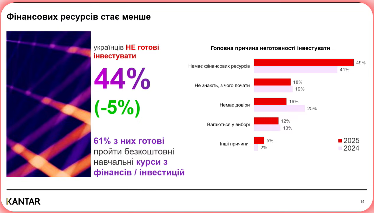 Общая ситуация и настроения инвесторов в Украине ухудшились по сравнению с прошлым годом. Об этом рассказал директор по развитию бизнеса исследовательской компании Kantar Ukraine Кирилл Ежов, представляя на конференции «Жить на проценты» результаты исследования инвестиционных настроений украинцев в 2025 году.