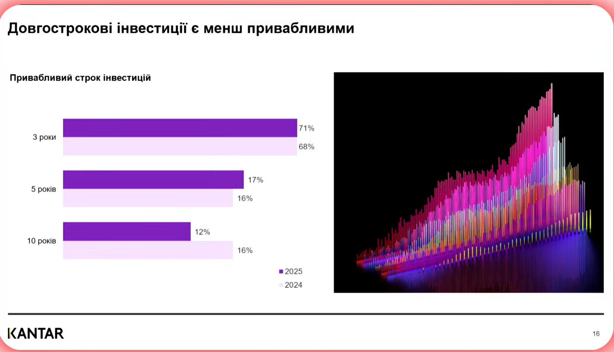 Долгосрочные инвестиции становятся менее привлекательными для украинцев в 2025 году по сравнению с 2024 годом. Наибольшее снижение интереса зафиксировано к инвестициям с горизонтом 10 лет, где доля заинтересованных инвесторов снизилась с 16% в 2024 году до 12% в 2025 году.