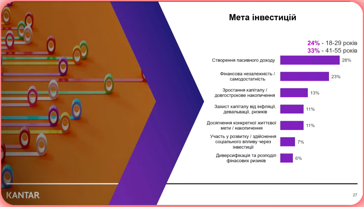 Основной целью инвестирования остается создание пассивного дохода, особенно среди старшей возрастной группы. Для молодежи (18−29 лет) более сильной мотивацией является финансовая независимость.