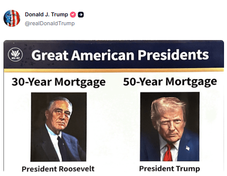 Директор Федерального агентства жилищного финансирования (FHFA) Билл Пулте заявил в субботу, что его ведомство «работает над» внедрением ипотеки на 50 лет после того, как Трамп опубликовал в соцсетях изображение с подписью «50-year Mortgage» («ипотека на 50 лет»). «Это полностью меняет правила игры», — написал Пулте.