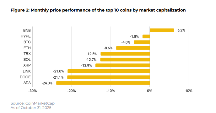 Октябрь отразился снижением общей капитализации криптовалют на 6,1% первым отрицательным октябрем с 2018 года. Коррекция была спровоцирована исторически большой ликвидацией позиций на $19 млрд 10 октября. Об этом говорится в ежемесячном обзоре рынка Binance Research, аналитического подразделения криптовалютной биржи Binance.