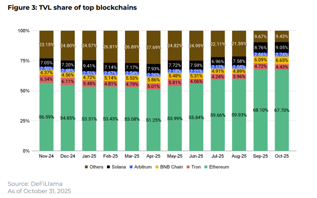 USDT продолжает расширять доминирование над USDC. В октябре появились новые fiat-backed стейблкоины: EUROD (привязанный к евро) и JPYC (привязанный к японской иене), что расширяет разнообразие стейблокинов вне доллара США и повышает эффективность международных платежей.