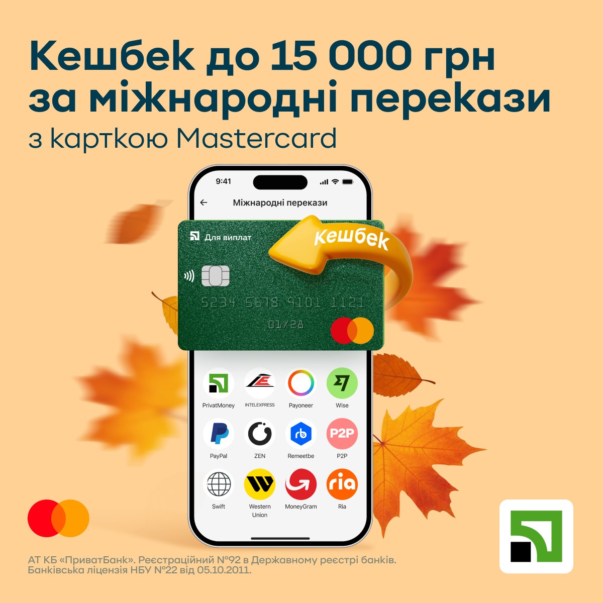Клиенты Приватбанка смогут получить ежемесячный кешбэк до 15 000 грн за получение или отправку международных переводов на карту Mastercard.