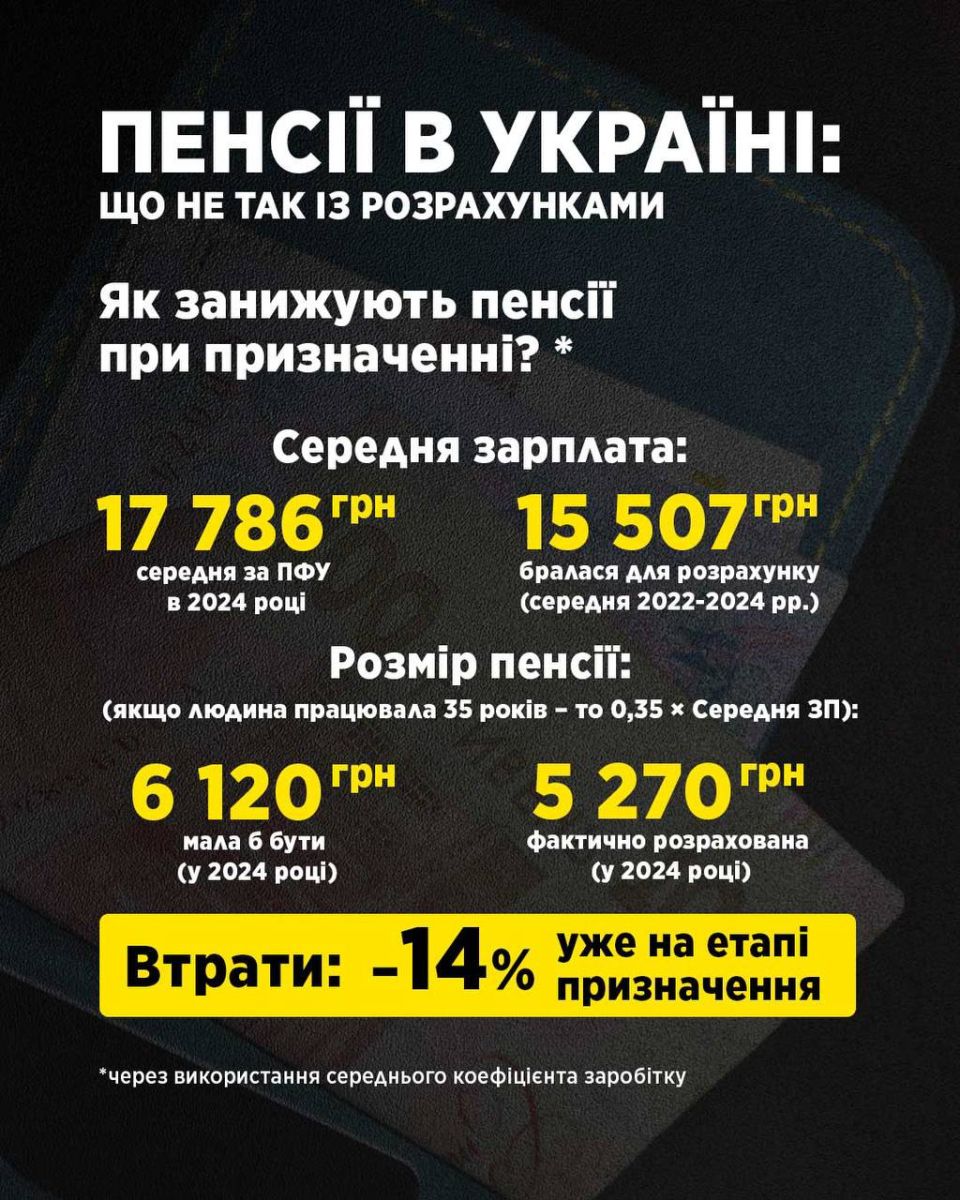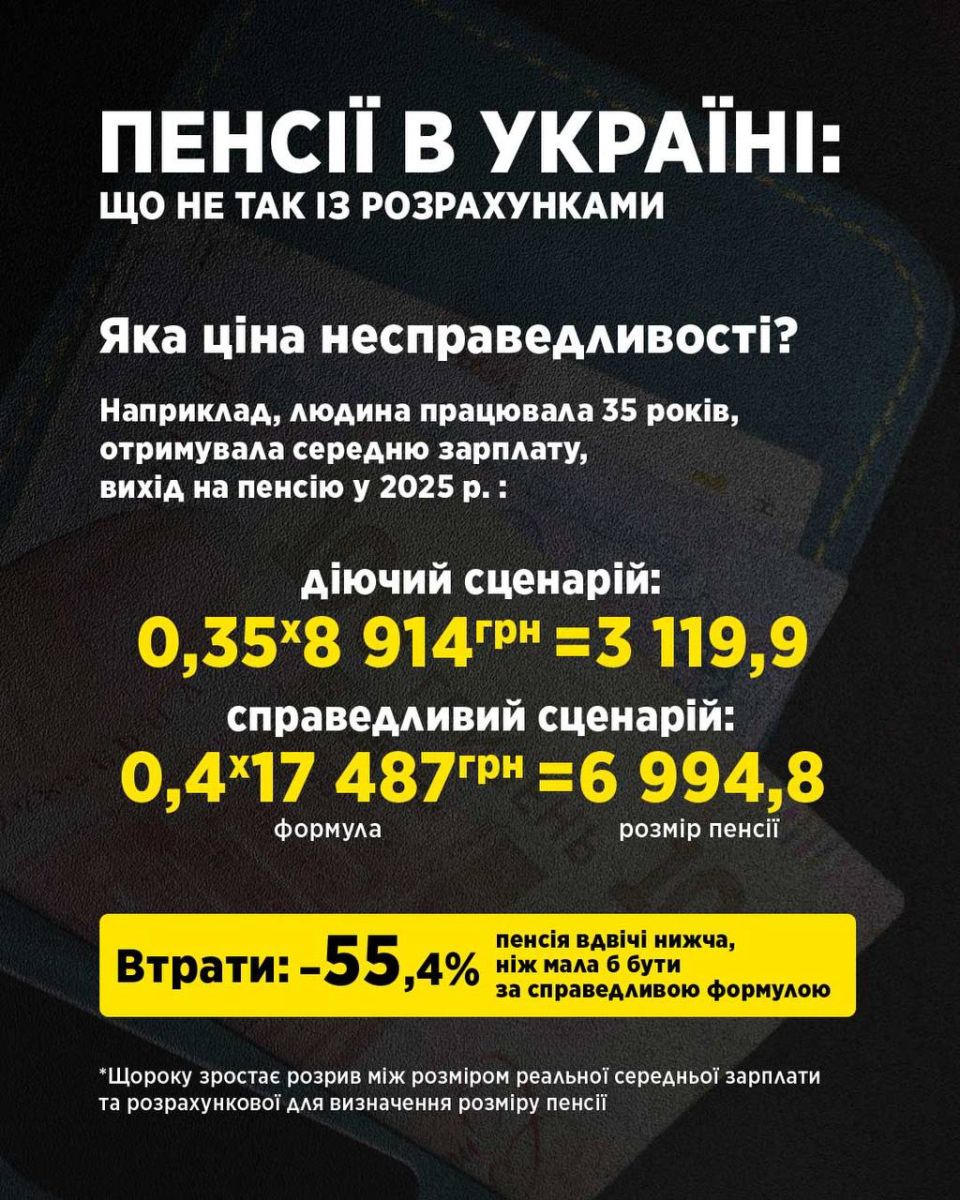 «Человек, 35 лет работавший и получавший среднюю зарплату, сегодня при выходе на пенсию в 2025 году по действующей формуле будет получать лишь около 3119 грн. В то время как по другой, все же более справедливой, системе расчета пенсия должна составлять примерно 6995 грн. „Мелочь“ в 55,4%, которая решает, сможет ли человек жить, будет ли выживать», — отметил Гетманцев.