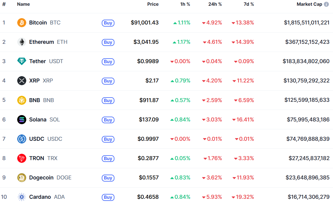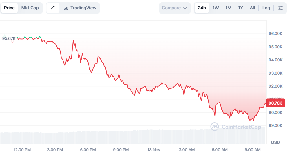 Сегодня, 18 ноября, курс первой криптовалюты снизился до менее $90 тысяч, а Ethereum — до $3 000. Об этом свидетельствуют данные CoinMarketCap.