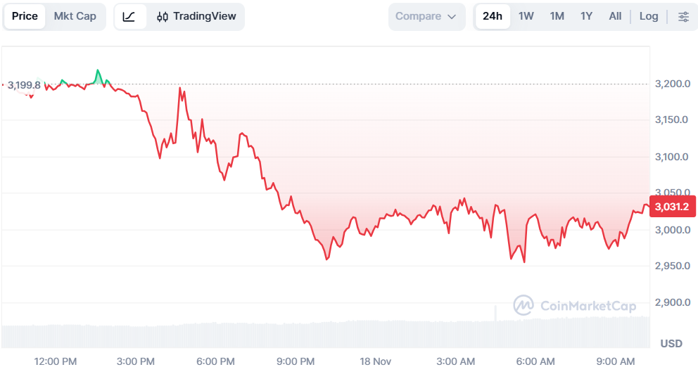 Ethereum в данный момент упал до $2 955. Впоследствии он поднялся до 3 041. Падение за последние 24 часа составляет 4,61%, за неделю — 14,39%.