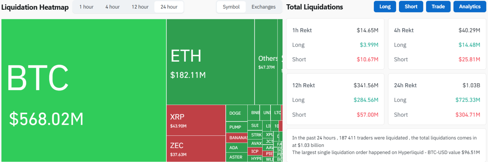 За последние сутки на крипторынку зафиксированы массовые ликвидации, совокупный объем которых превысил $1 миллиард, затронув более 187 тысяч трейдеров. Об этом свидетельствуют данные CoinGlass. Подавляющее большинство этих потерь пришлось на лонг-позиции: