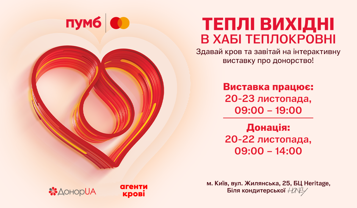 Донорский хаб «Теплокровные», созданный по инициативе ПУМБ и Mastercard, открывает мобильное интерактивное пространство о крови и донорстве. И вместе с партнерами — общественными организациями «Агенты крови» и ДонорUA и кондитерской Honey — приглашают на открытие выставки и донацию крови. Мероприятие «Теплые выходные» состоится 20−23 ноября по адресу: ул. Жилянская, 25, БЦ Heritage (возле Honey).