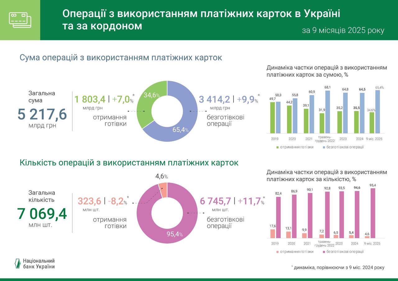 В целом количество операций (безналичных и получение наличных) в Украине и за ее пределами с использованием платежных карт, эмитированных украинскими банками, за указанный период составило 7 069,4 млн шт., а их сумма — 5 217,6 млрд грн.