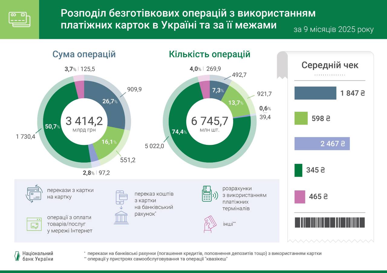 Остальные операции были бесконтактными (с бесконтактной картой или с помощью смартфонов и других гаджетов). Их сумма за девять месяцев 2025 года составила 1686,3 млрд грн (за девять месяцев 2024 года — 1349,1 млрд грн).