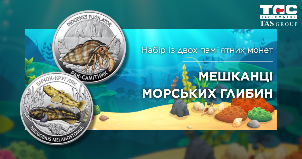 Набор из двух памятных монет посвящен уникальным представителям морской фауны Черного и Азовского морей — неотъемлемой составляющей природного наследия Украины. Черное и Азовское моря играют важную роль в сохранении биоразнообразия региона, поддержании экологического равновесия и обеспечении экономической стабильности государства. Среди многих обитателей этих водоемов — рак-отшельник (Diogenes pugilator) и бычок-кругляк (Neogobius melanostomus) — виды, которые служат биоиндикаторами состояния морской среды и являются важными элементами морских экосистем. Этим набором из двух памятных монет Национальный банк Украины стремится привлечь внимание к проблеме сохранения морей, напомнить об ответственности человечества за охрану природных ресурсов и подчеркнуть значение морской биоты в формировании экосистемы Украины.