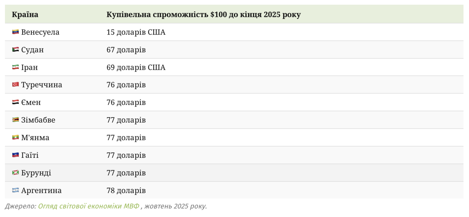МВФ ожидает, что уровень инфляции в Венесуэле в 2025 году составит около 549%. На практике это означает, что на 100 долларов, сэкономленных в начале года, хватит товаров всего на 15 долларов до декабря. Экономические санкции со стороны США усугубили финансовый кризис в стране.