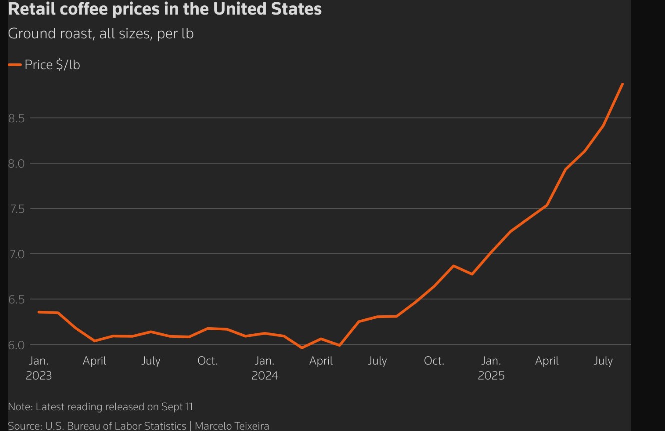 В США розничные цены на кофе выросли на 40% в годовом исчислении в сентябре, частично из-за пошлин. Рост цен на продукты питания является одним из ключевых факторов падения рейтинга Трампа до самого низкого уровня с момента его возвращения к власти.