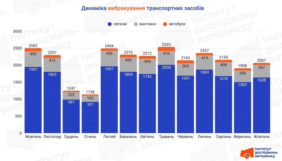 В октябре украинцы воспользовались возможностью выбраковки более двух тысяч раз. Чаще всего на металлолом отправляли легковые автомобили — 1638 единиц. Также свои последние километры преодолели 367 грузовиков и 62 автобуса. Об этом сообщают в Институте исследований авторынка.